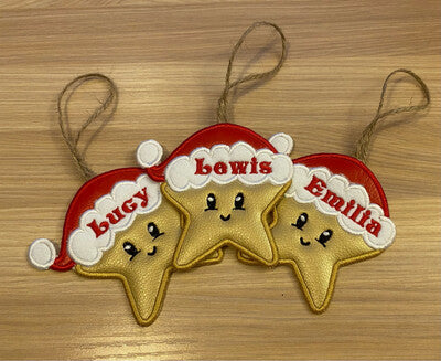 Cute stars with Santa hats. Made with marine vinyl and felt. Can be personalised with a name. Pick from Gold, Silver, Pink and Blue.