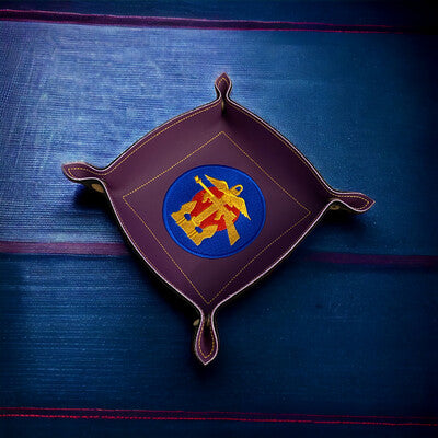 This is an 8”x8” when flat dice tray. It is made with marine vinyl upper and black felt on the bottom. The VWA logo is also embroidered in the middle of the tray.